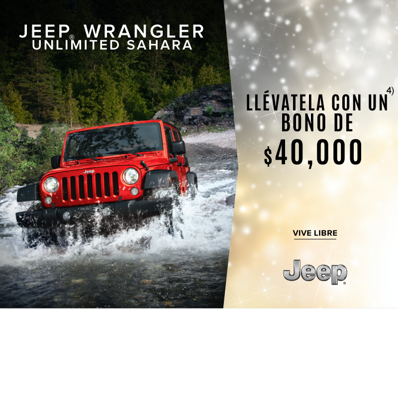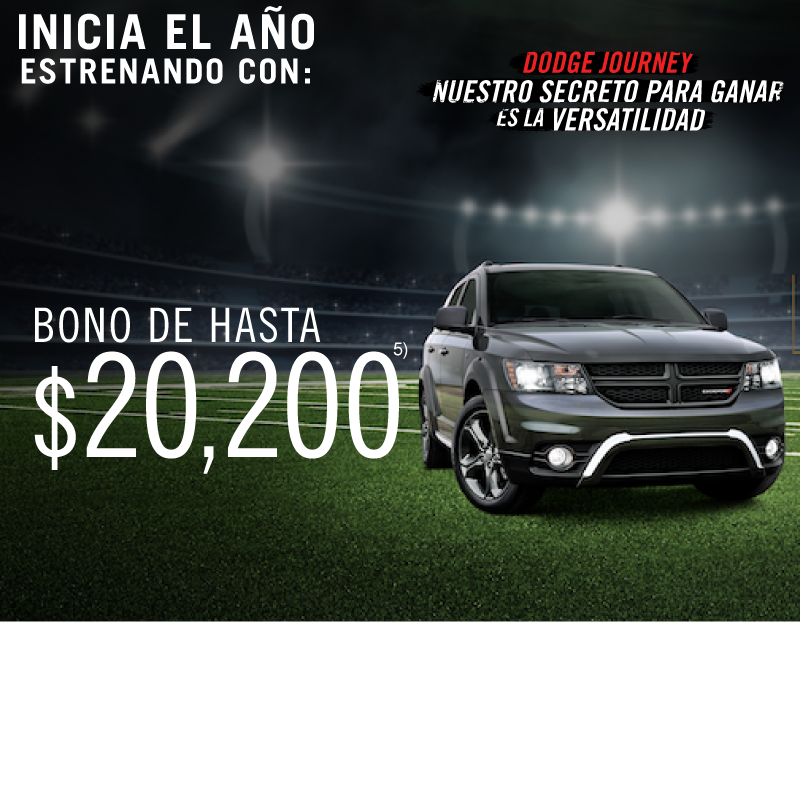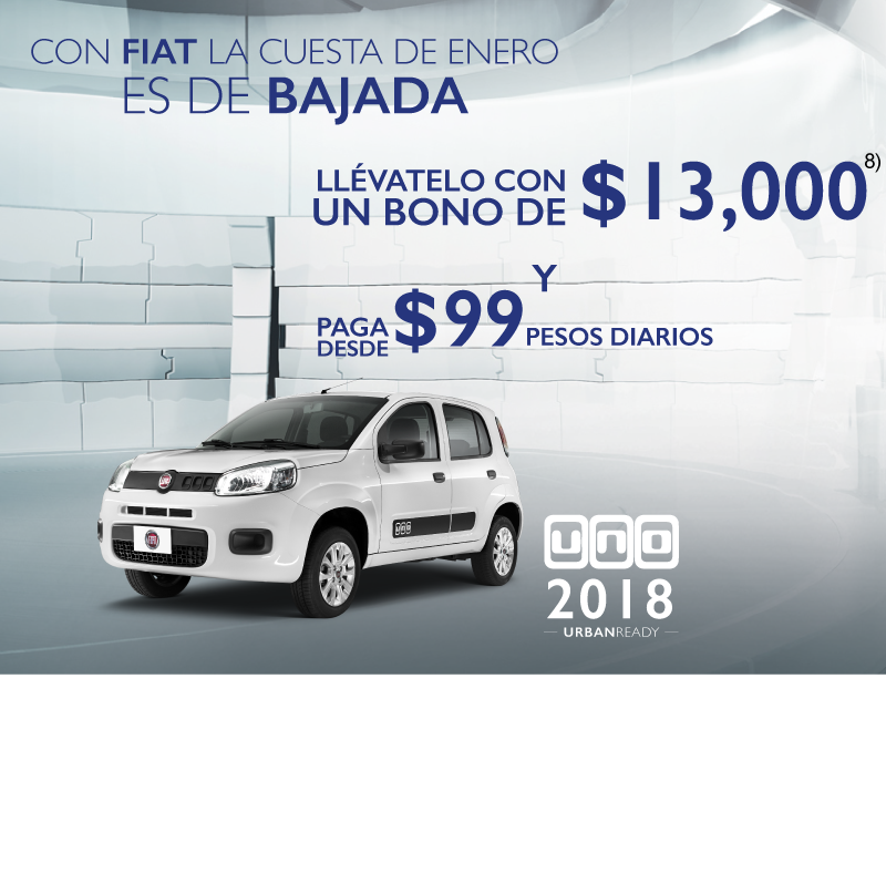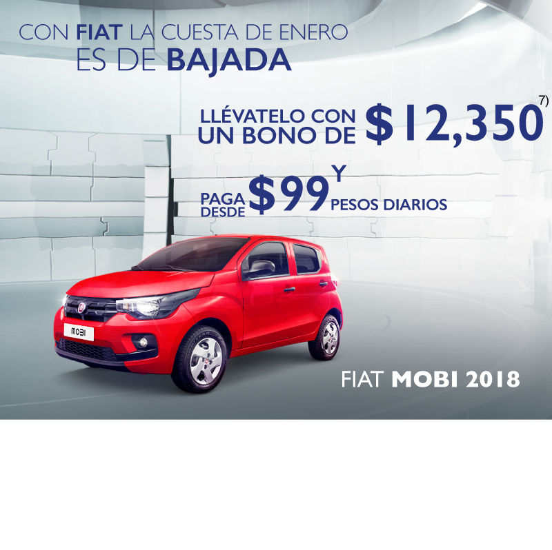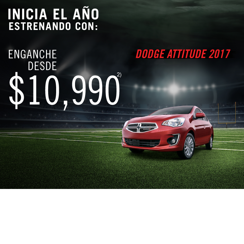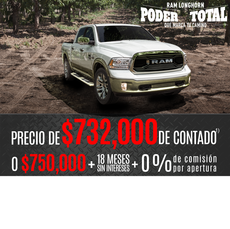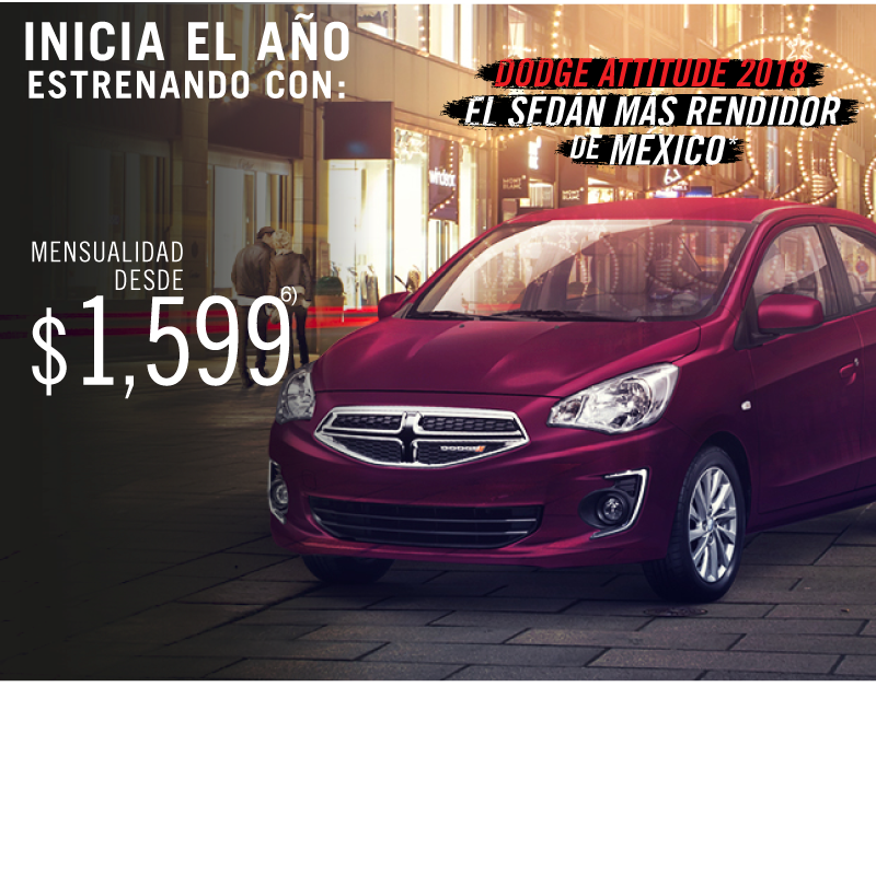 1) Precio de $750,000 aplica para Longhorn 2017 aplicando bono promocional de $197,400 al precio de lista. Comisión por apertura de 0% calculado para plan de 18 meses sin intereses, no incluye seguro del auto ni otros seguros, aplica para Ram Crew Cab Longhorn modelo 2017. Precio de $732,000 aplica para pago de Ram Crew Cab Longhorn modelo 2017 solamente en pago de contado. 2) Enganche de $10,990 pesos aplica para Attitude SE TM 2017 aplicando los descuentos promocionales del mes por $8,400 con 10% de enganche. Consulta bonos por versión con tu asesor de ventas. 3) Bono de $100,000 aplica para Grand Cherokee Limited 20" en operaciones de contado o financiamiento. Consulta bonos por versión con tu asesor de ventas. 4) Bono de $40,000 aplica para Wrangler 2017 en todas sus versiones en operaciones de contado o financiamiento. 5) Bono de $20,200 aplica para Journey SE 7 pasajeros 2017 en operaciones de contado o financiamiento. Consulta bonos por versión con tu asesor de ventas. 6) Mensualidad desde $1,599 aplica para Attitude SE TM 2018 con enganche de 54.84% a un plazo de 72 meses con pagos flexibles de $6,163 pagando el seguro anual de contado. 7) Bono de $12,350 aplica para Mobi Like 2018. $99.00 pesos diarios aplican para Mobi Like 2018 aplicando bono de $12,350 al enganche de 32.13% a un plazo de 72 meses pagando el seguro anual de contado. 8) Bono de $13,000 aplica para Uno Like 2018. $99.00 pesos diarios aplican para Uno Like 2018 aplicando bono de $13,000 al enganche de 36.91% a un plazo de 72 meses pagando el seguro anual de contado. Las fotografías, equipamientos, colores, características, materiales, especificaciones técnicas y/o accesorios de los vehículos que aparecen en esta publicación son de uso netamente ilustrativo e informativo. Consulta términos y condiciones con nuestros asesores de ventas. Vigencia del 8 de enero de 2018 al 1 de febrero de 2018.