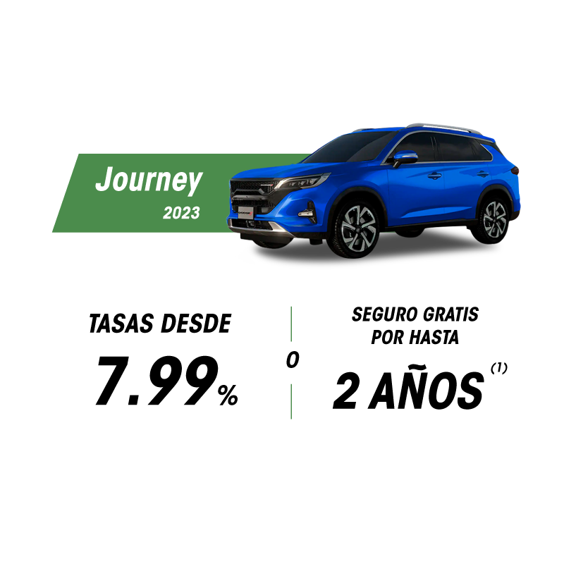(1) Tasa desde 7.99% aplica para Journey 2023 en todas sus versiones en operaciones de financiamiento con STM Financial México, en un plan Preferente con enganche desde 35% a un plazo desde 12 hasta 24 meses con comisión por apertura de 1.5%. 2 años de seguro gratis aplica para Journey 2023 en un plan tradicional SB con enganche desde 35% con aseguradora GNP con uso particular únicamente en operaciones de financiamiento con STM Financial México. Créditos sujetos a autorización de la financiera.