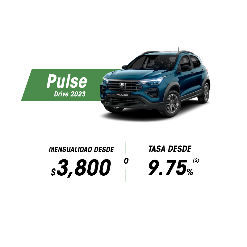 (2) Mensualidad desde $3,800 aplica para Pulse Drive 2023 en operaciones de financiamiento con STM Financial México con un enganche de 49.73% a un plazo de 72 meses con un plan Plus SB, el seguro deberá ser pagado anual de contado. Incluye pagos flexibles de $12,841. Tasa desde 9.75% aplica para Pulse 2023 en todas sus versiones en operaciones de financiamiento con STM Financial México, en un plan plus SB con enganche desde 35% a un plazo de 12 a 24 meses con 1.5% de comisión por apertura. Créditos sujetos a autorización de la financiera.
