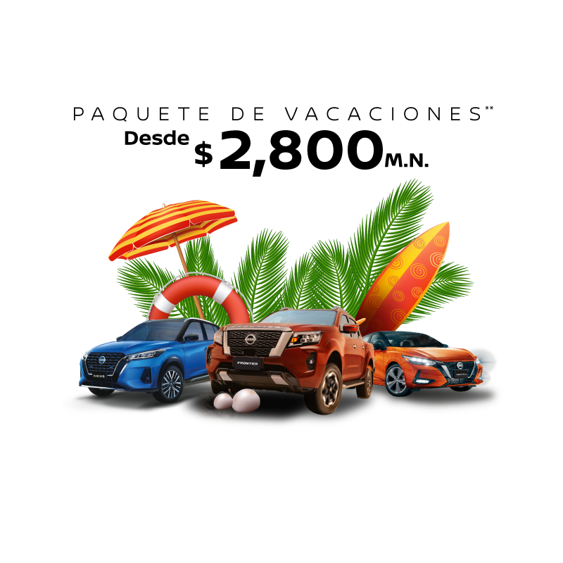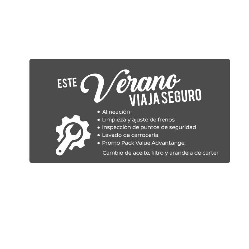 ** Promoción válida para vehículos fuera de garantía (2013 al 2018) Modelos participantes: Versa, March, Tiida, Kicks, Sentra, Xtrail, Pathfinder, NP300, NP300 Frontier, Urvan, Paquete de vacaciones de verano incluye: 4lts de aceite 20W50, 1 filtro de aceite, 1 arandela de carter, 1 Limpiador de frenos y Mano de obra. Los precios exhibidos incluyen IVA y están expresados en M.N., Para modelo Sentra (2013 al 2018) el precio es desde $3,100.00. Las fotografías, equipamientos, colores, características, materiales, especificaciones técnicas y/o accesorios de los vehículos que aparecen en esta publicación son de uso netamente ilustrativo e informativo. Vigencia del 1 al 31 de agosto del 2023.