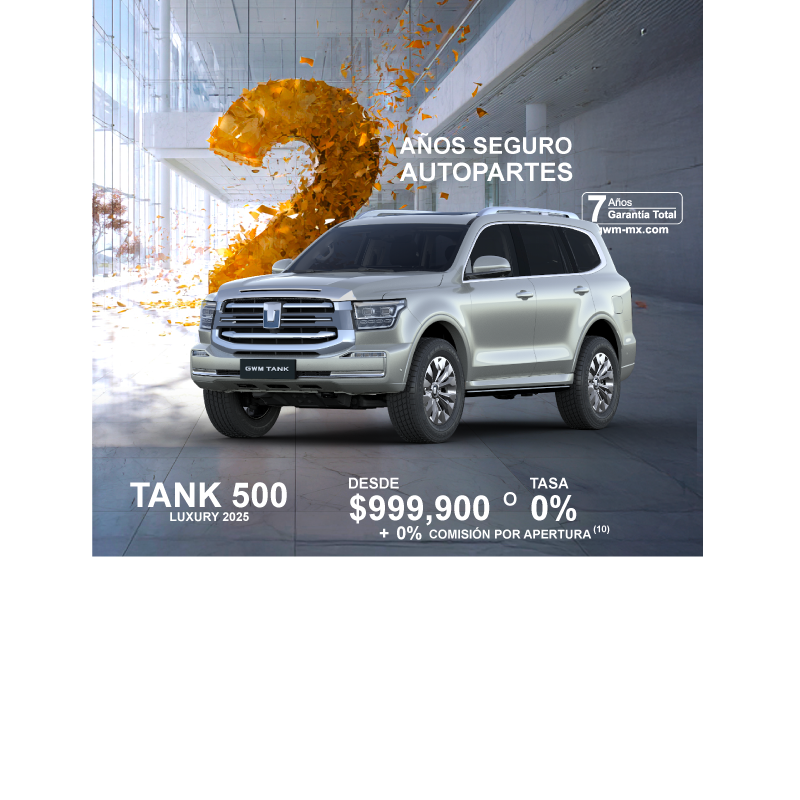 10) Consulta precios, términos, condiciones, rendimiento de combustible, especificaciones técnicas del vehículo, programas de financiamiento y seguros en www.gwm-mx.com o en un Distribuidor GWM autorizado. Imagen de carácter ilustrativo. Promoción aplicar para Tank 500 versión Luxury año modelo 2025. Precios sujetos a cambio sin previo aviso, costo final podrá variar dependiendo de las características, forma de pago, tarifas y descuentos, entre otros.